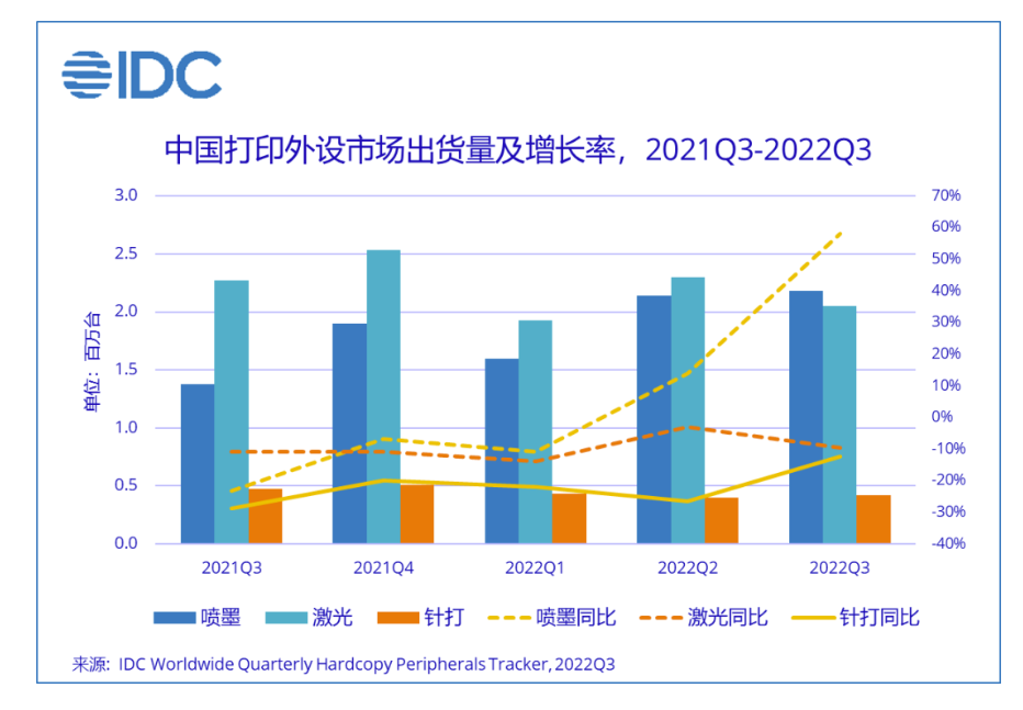 根據(jù)IDC統(tǒng)計(jì)稱,今年三季度,我國(guó)市場(chǎng)的噴墨打印機(jī)出貨218.0萬(wàn)臺(tái),同比增長(zhǎng)58.2%;激光打印機(jī)出貨量205.0萬(wàn)臺(tái),同比下降9.7%;針式打印機(jī)出貨量41.9萬(wàn)臺(tái),同比下降12.3%。