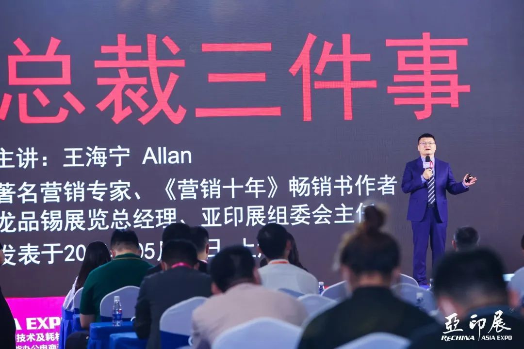 ▲著名營(yíng)銷(xiāo)專(zhuān)家、龍品錫展覽總經(jīng)理、亞印展組委會(huì)主任王海寧致歡迎辭,并發(fā)表了題為“盈利企業(yè)總裁三件事”的主題演講。