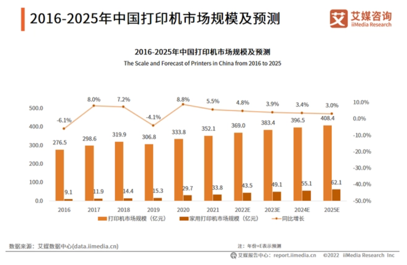 艾媒咨詢發(fā)布的數(shù)據(jù)顯示,2021年中國打印機市場規(guī)模為352.1億元,其中家用打印機市場規(guī)模為33.8億元。艾媒咨詢分析師認為,中國家用打印機入戶率仍有上升空間,隨著國產(chǎn)品牌崛起以及設備換新潮,預計2025年家用打印機市場規(guī)模為62.1億元。